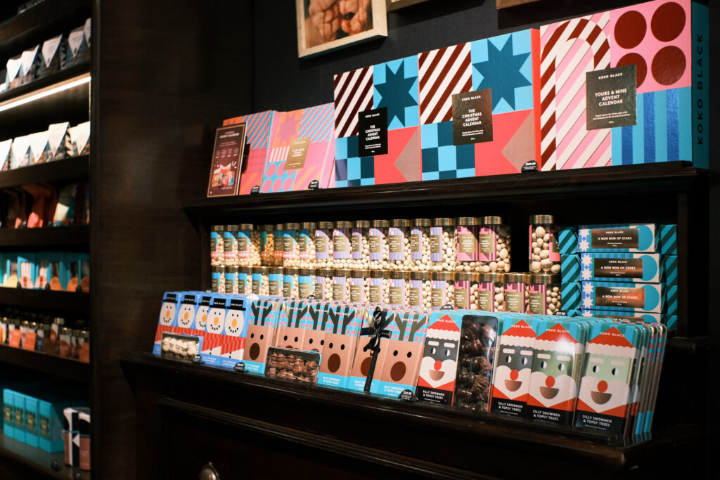 ショーケース内には手作りの粒チョコレートが綺麗にディスプレイされ、店内にはカラフルでポップなパッケージの商品が所狭しと並べられています。